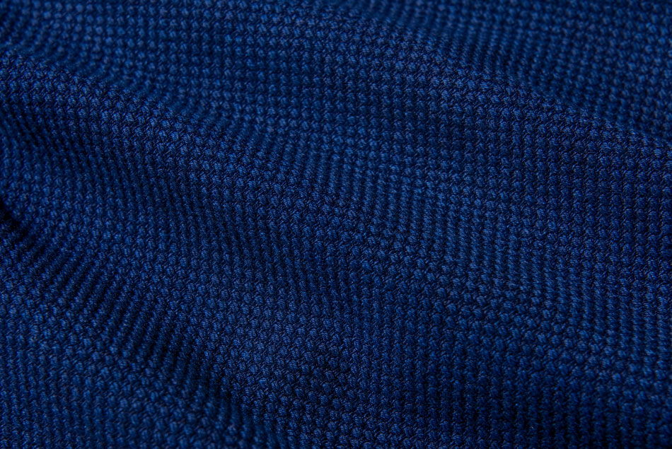 本藍でカセ染めした糸を使用しており、縦にうっすらと走るムラが特徴です。ドビー織機による二重織により、厚みと弾力を持たせつつ、軽やかな仕上がりを実現しました。糸の染色や生地の織り、仕上げの工程では高温の熱を使用せず自然乾燥させることで、柔らかくふくらみのある風合いに仕上げています。着心地を追求し、長年にわたり定番として作り続けている、オリジナルの刺し子素材です。