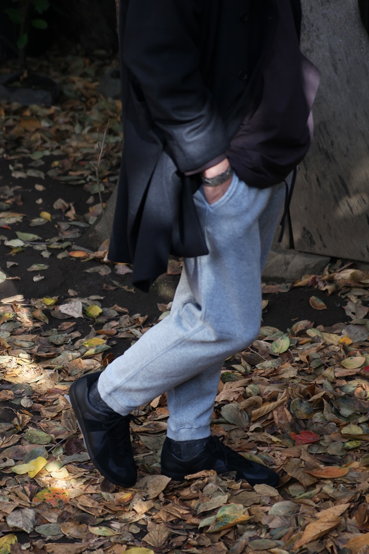 ラフなスウェットパンツに崩しすぎないようプルオーバーのシャツを合わせました。パンツのすっきりとしたシルエットをしっかりと見せるために、シャツもアウターも少しゆったり目のものをチョイスしています。