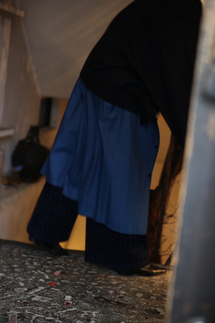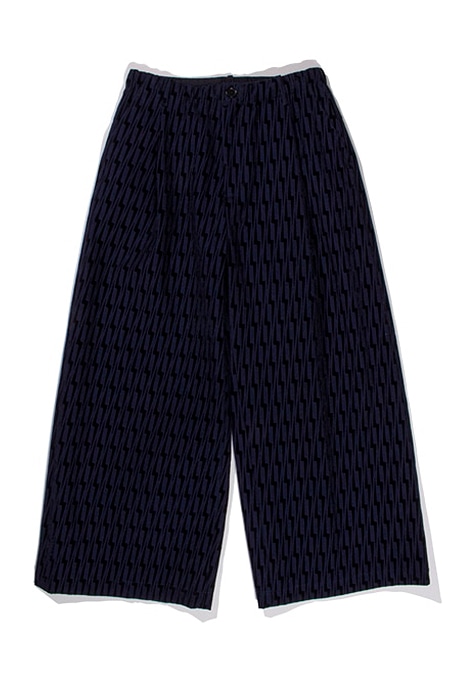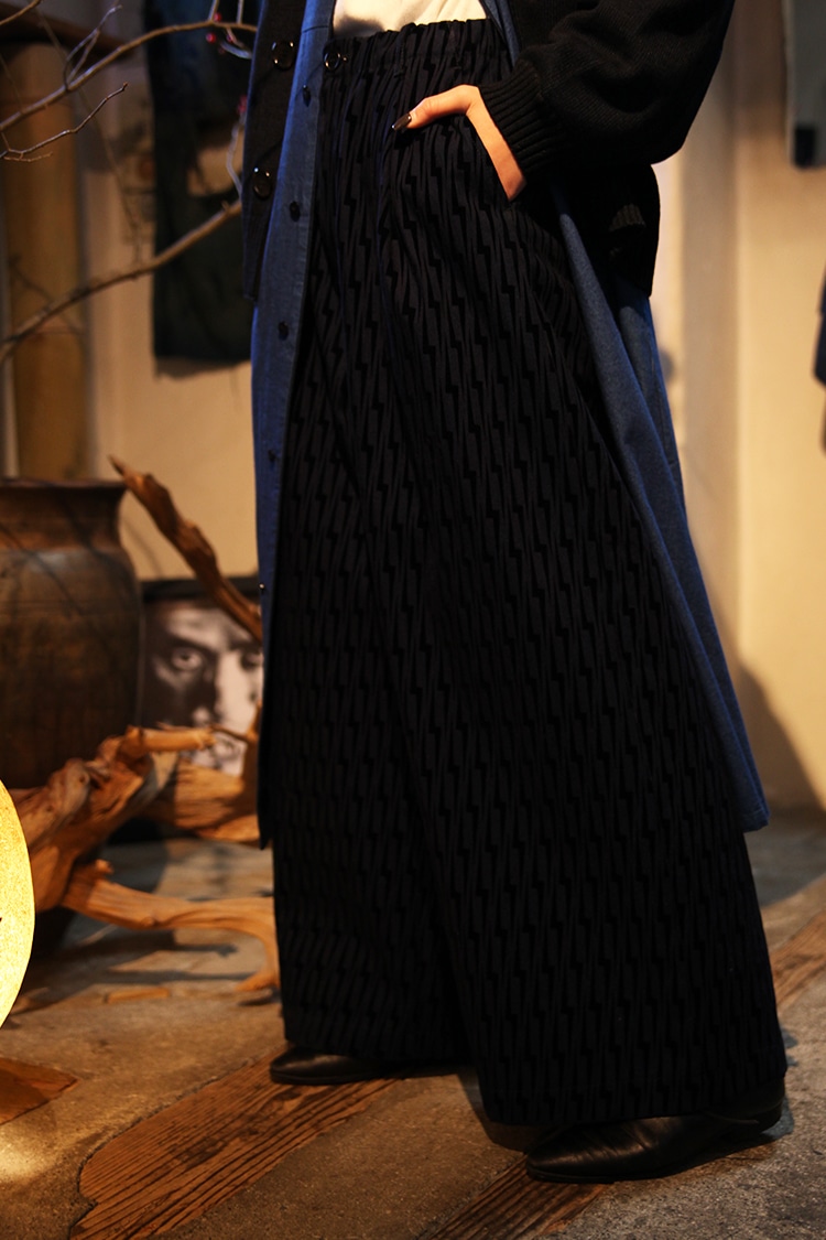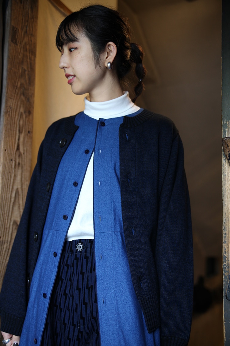 パンツがボーイッシュだったので女性らしさを出すために、ワンピースと丸みを帯びたカーディガンを選びました。インパクトのある柄なので他のアイテムは極力シンプルに。ワンピースは前を開けてパンツが主役のコーディネートにしています。