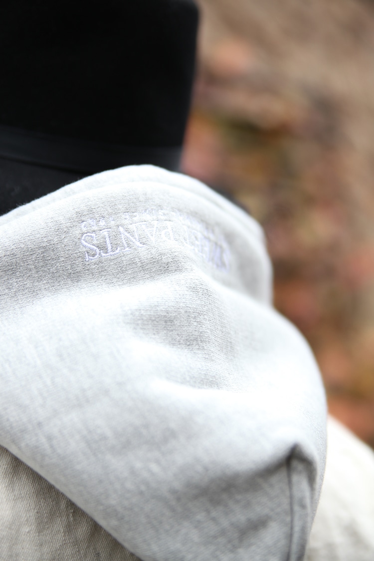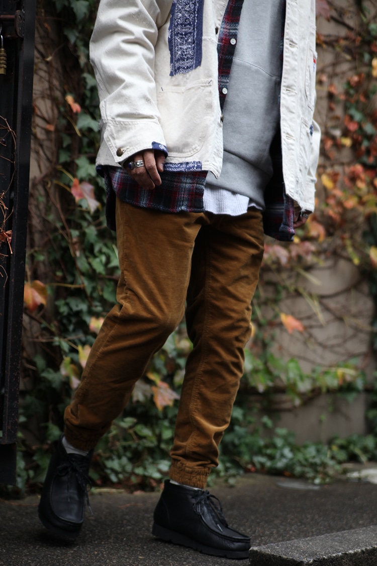 パンツが細身なのでボリュームを出すためにトップスをレイヤードしました。後ろから見てポイントになるように中にパーカを着て、フードを出しています。色味を足すために大きめのシャツを選んだのもポイントです。