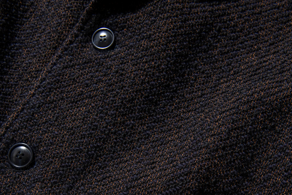 撚糸をかけていないロービングヤーンに、トップカラーのリサイクルウールを組み合わせることで、凹凸のある独特な表面感に仕上げました。ロービングヤーンは通常よりも撚りが甘いため、見た目のボリュームに対して軽さがあるのが特徴です。ドビー組織を使い、深い紺色にゴールドカラーが散りばめられたような奥行きのある表情を演出しています。