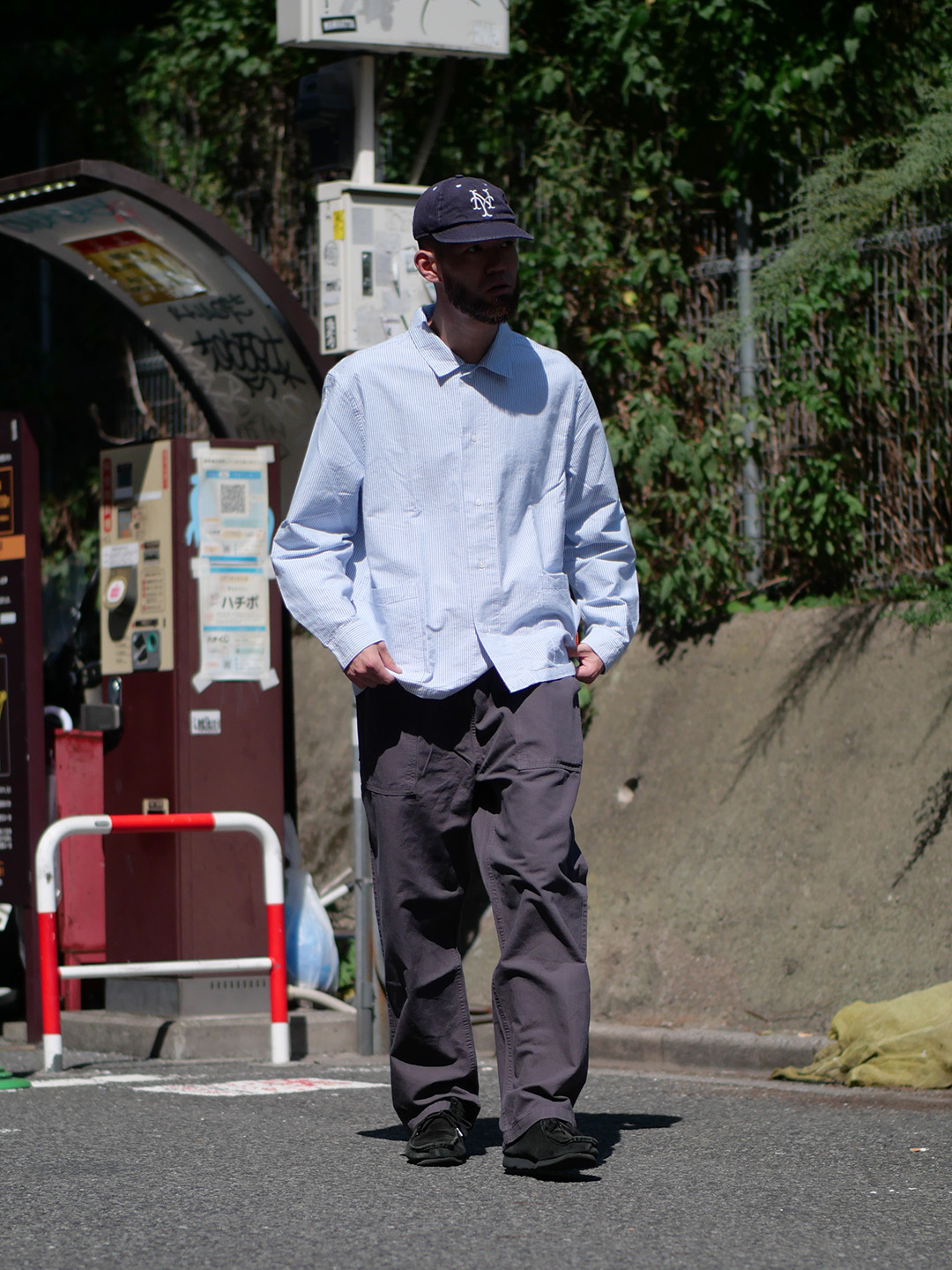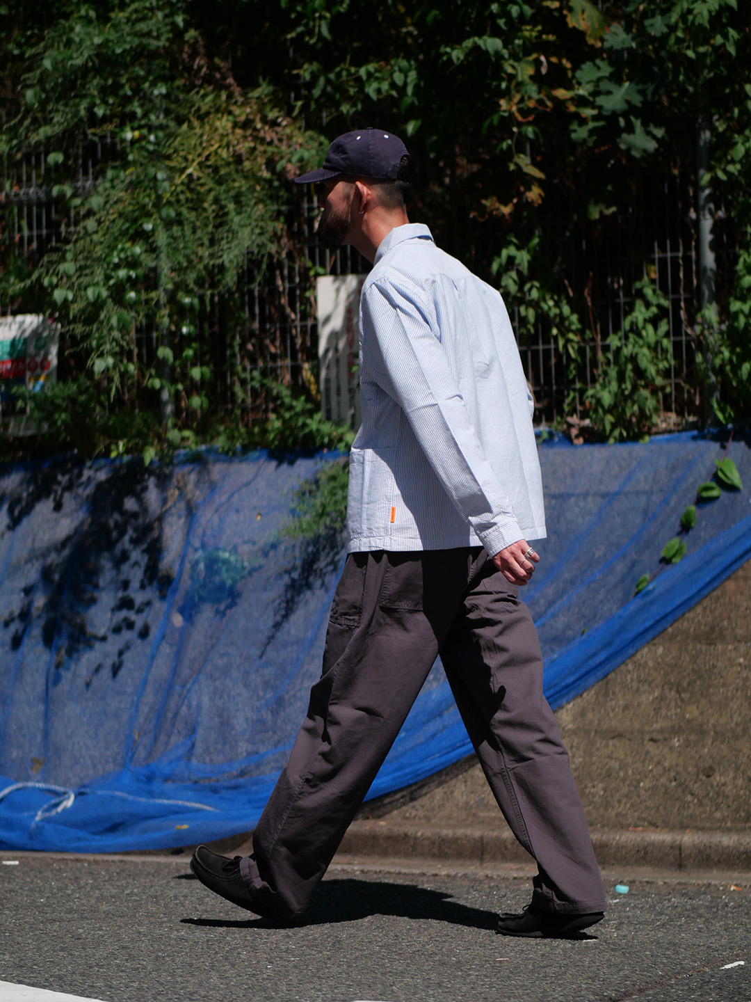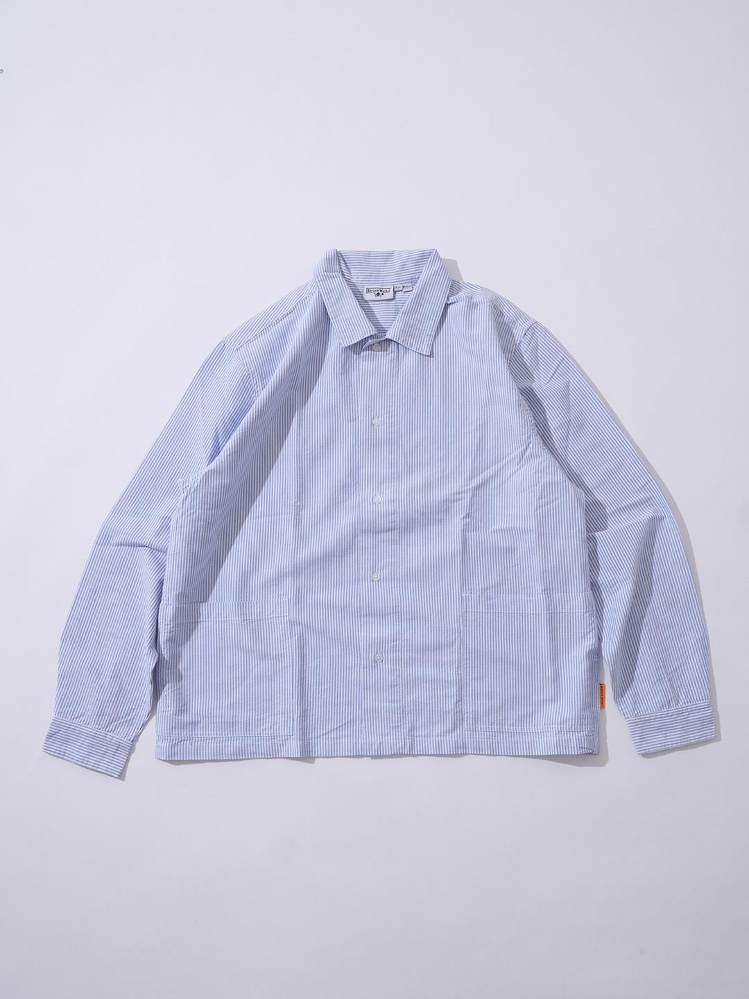 一見なんてことないブルーストライプのシャツですが、よく見るとフロント下にポケットが付いていて、カバーオールのような形になってます。