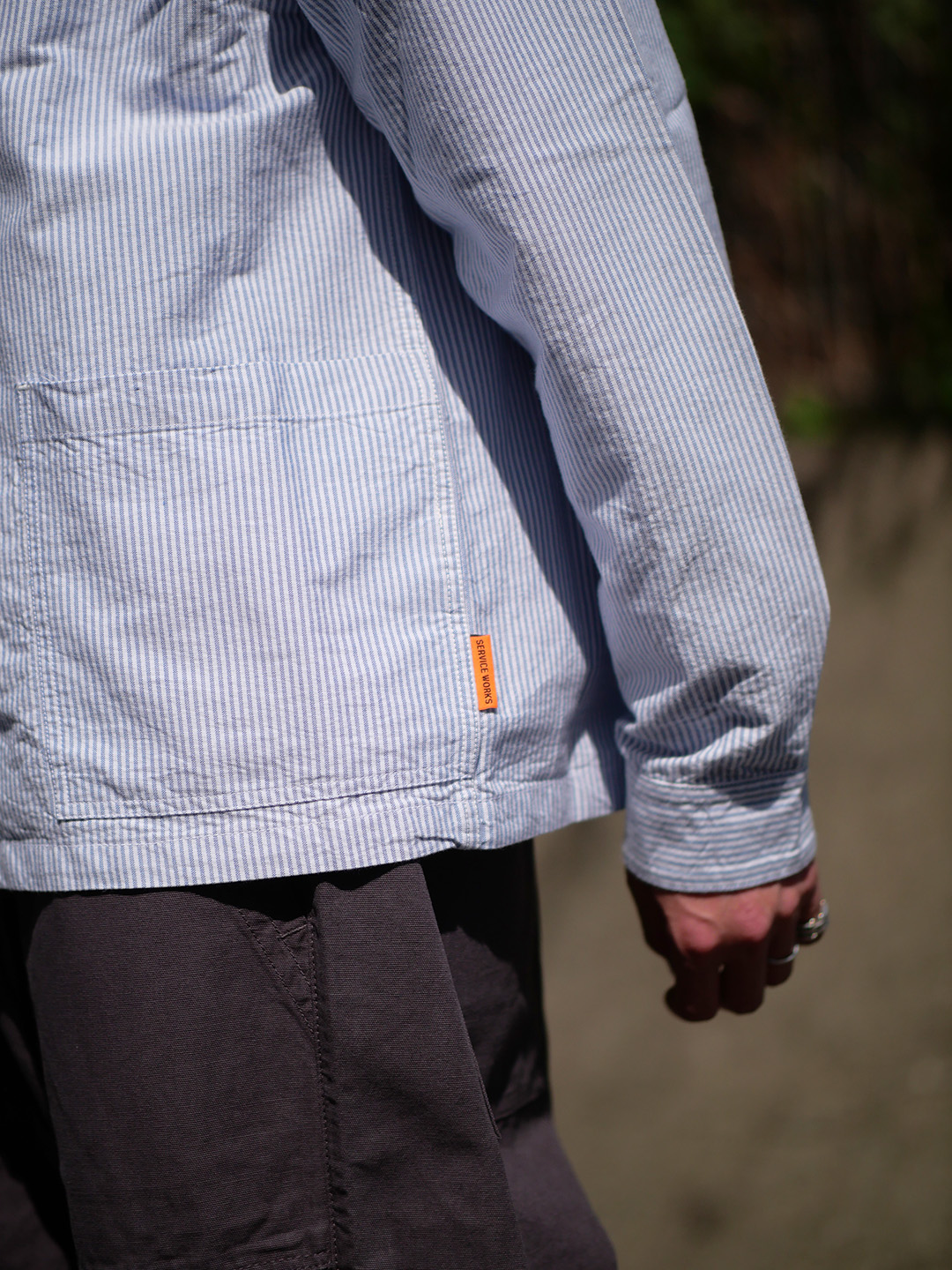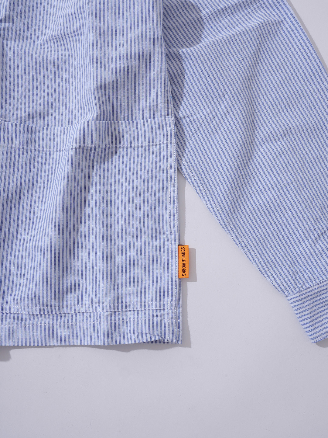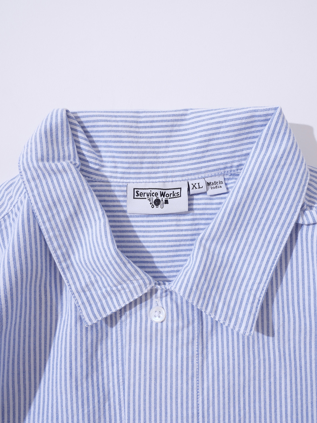 一見なんてことないブルーストライプのシャツですが、よく見るとフロント下にポケットが付いていて、カバーオールのような形になってます。