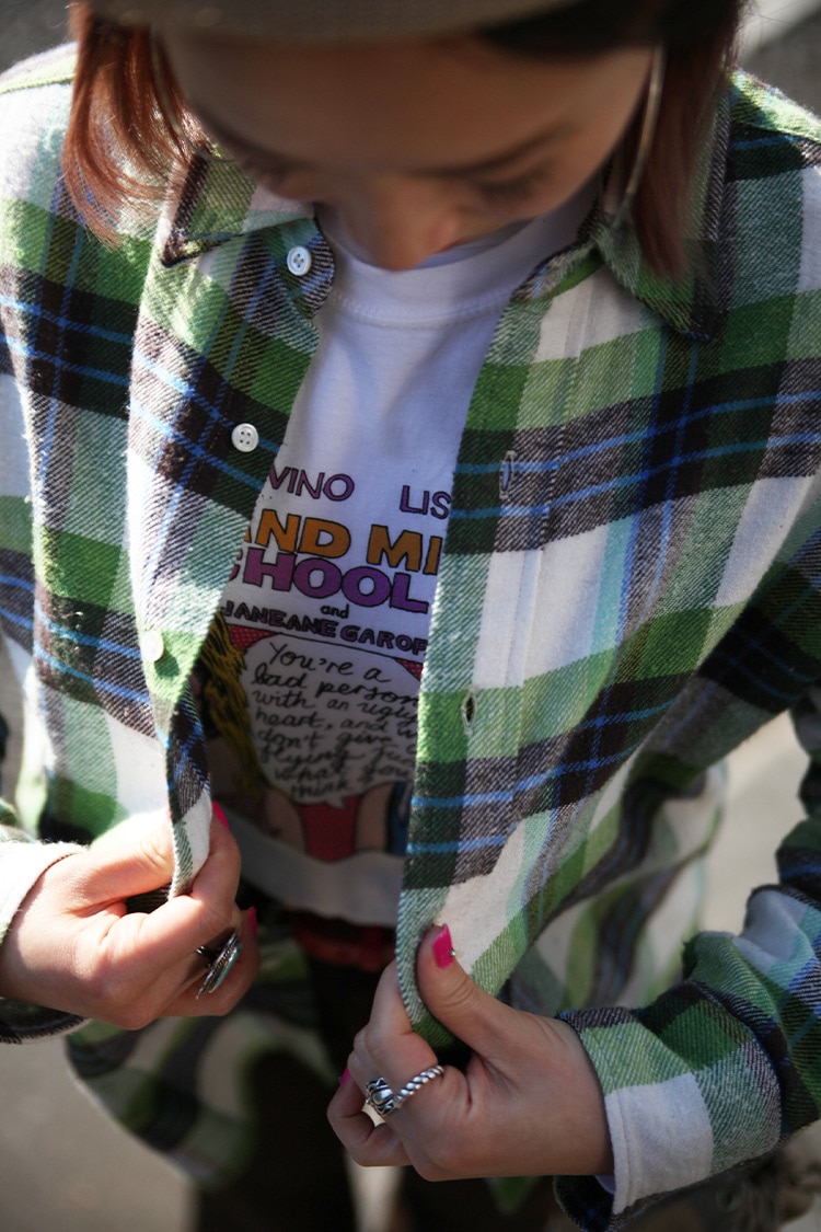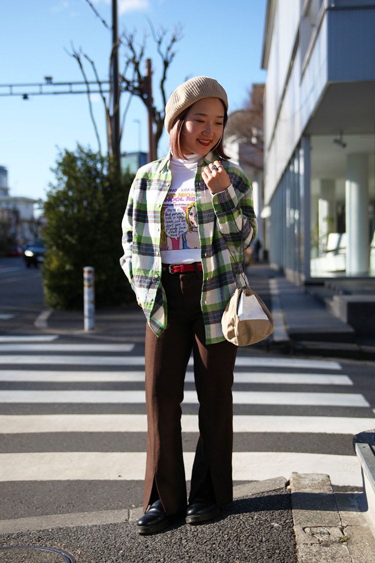 春らしい色合いのシャツにポップなグラフィックが目を引くTシャツをあわせました。