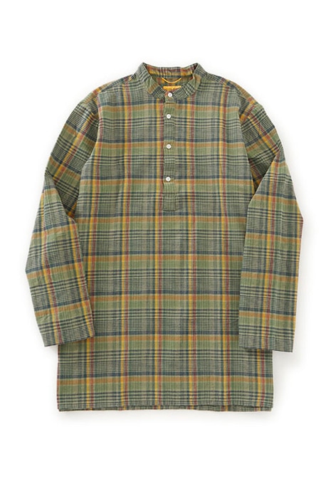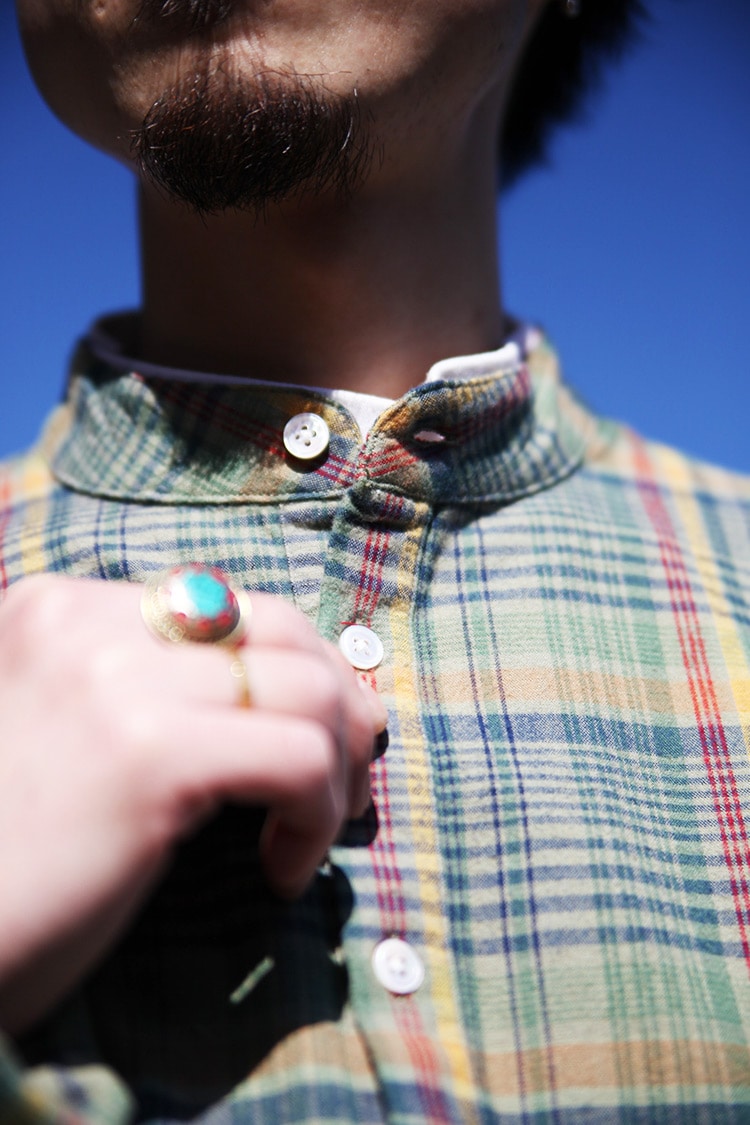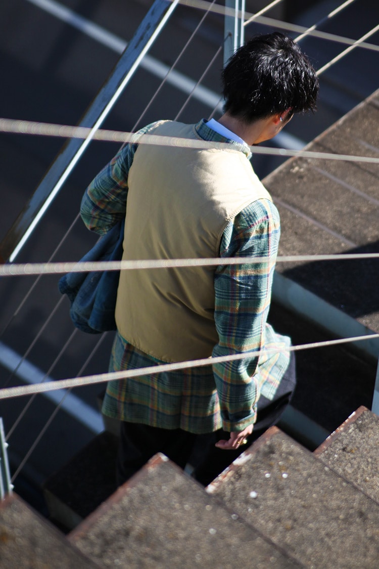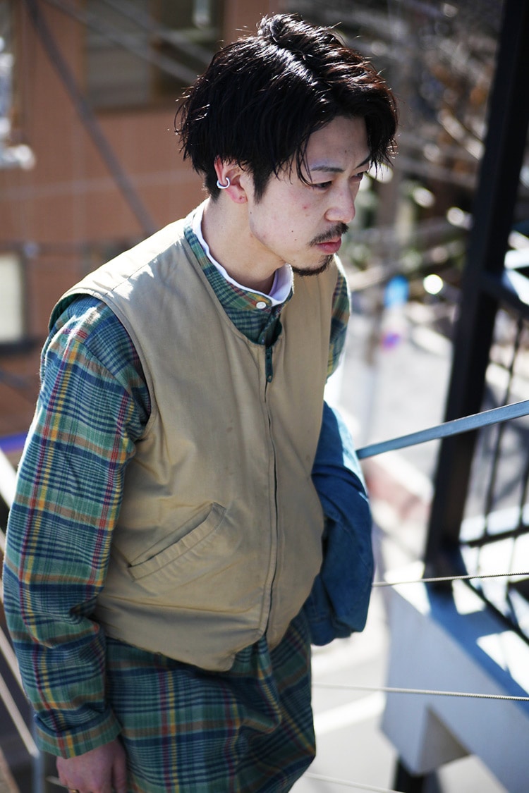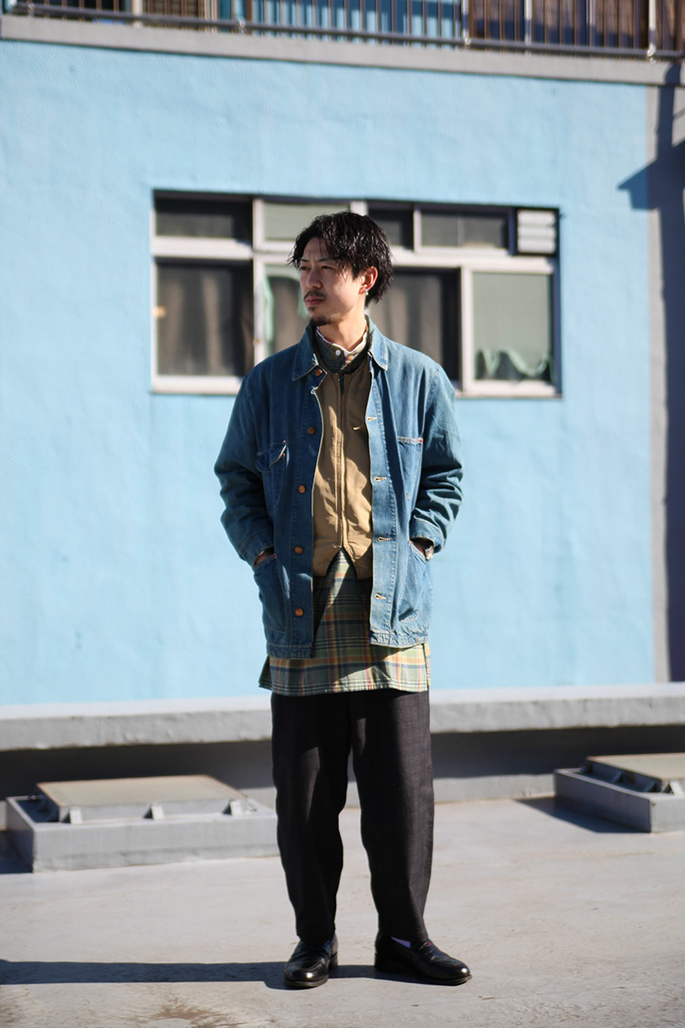 ブラッシュされた生地と色味が古着とも好相性なのでデニムカバーオールと合わせました。また特徴的な着丈の長さを活かしてレイヤードしています。スタンドカラーで首元がすっきりとしているのでインナーにモックネックを入れたのもポイントです。