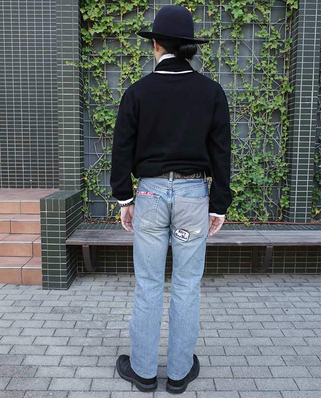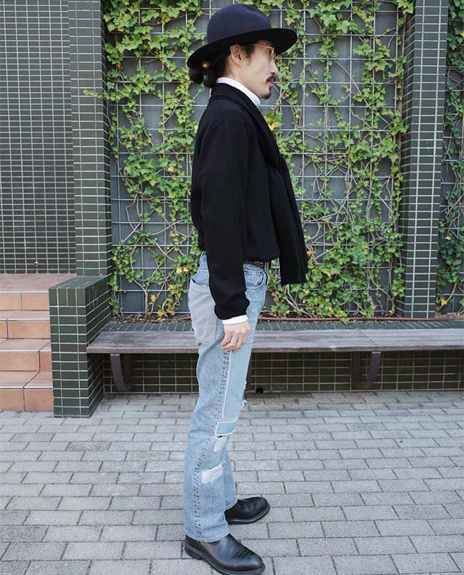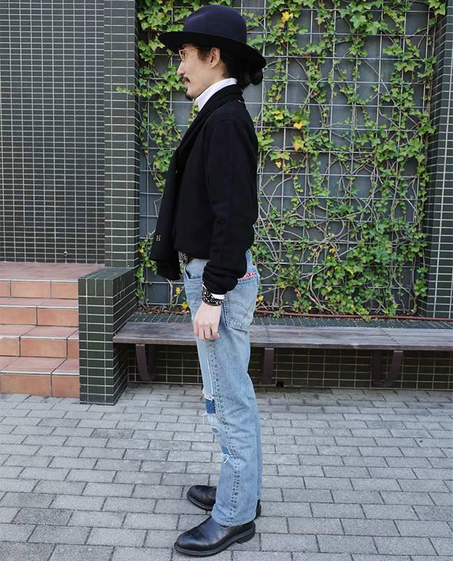POINT / Mサイズに上げても、元々細身のシルエットなので分かりやすくルーズにはなりません。 ジャケットのボタンを閉めて、全体のバランスを取りました。