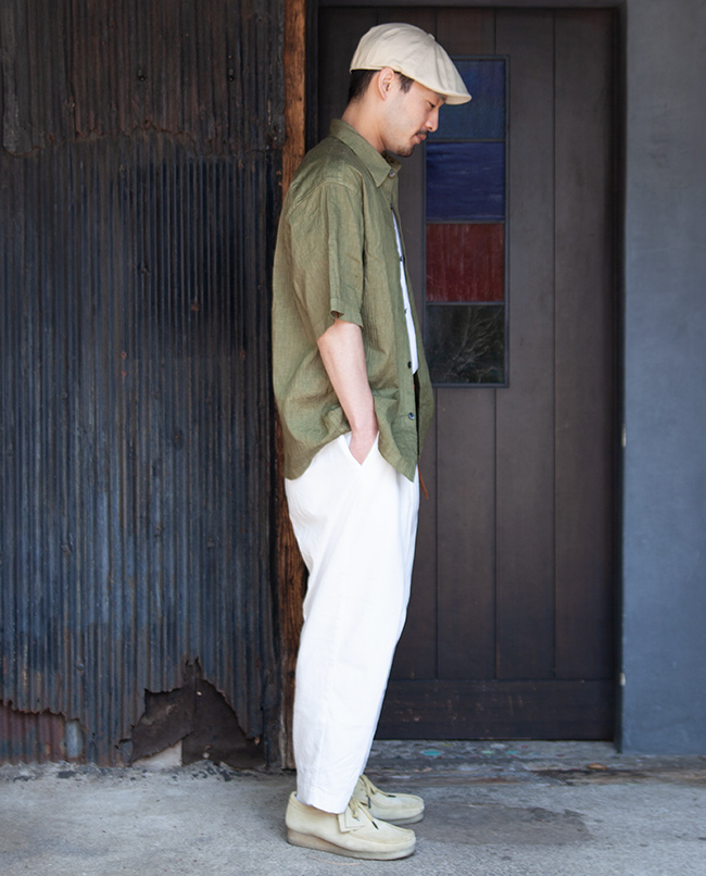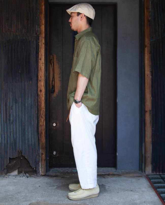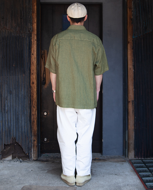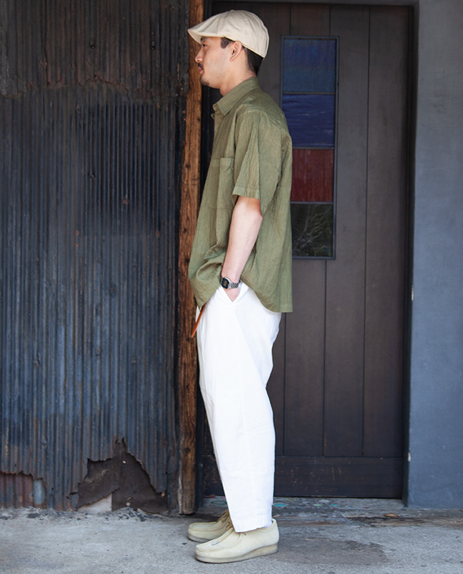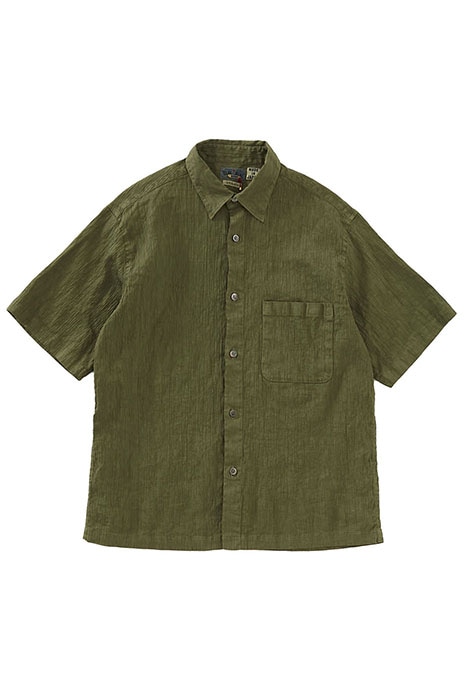 滑らかな光沢が美しいアイリッシュリネンとウレタン糸、ナイロン糸で織り上げた楊柳素材を使用したスクエアカットのワイドシャツ。ブルーは天然の藍、グリーンは桑の葉を染料にそれぞれ100%天然の草木染めを職人の手作業によって施されています。オーバーサイズにしゃり感のある肌触りで真夏にも心地良いシャツです。