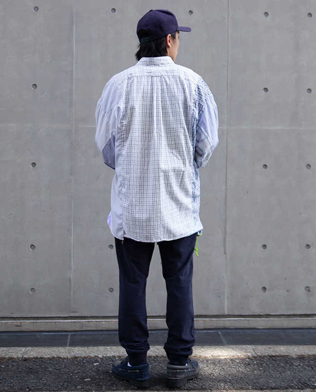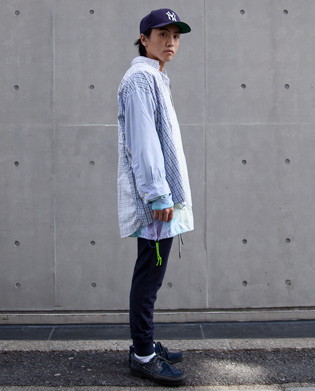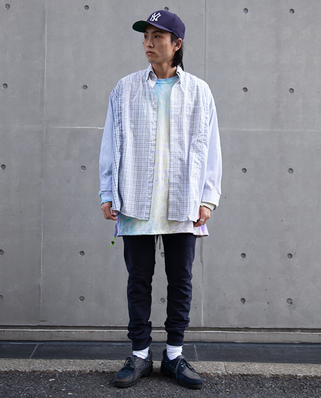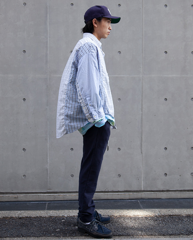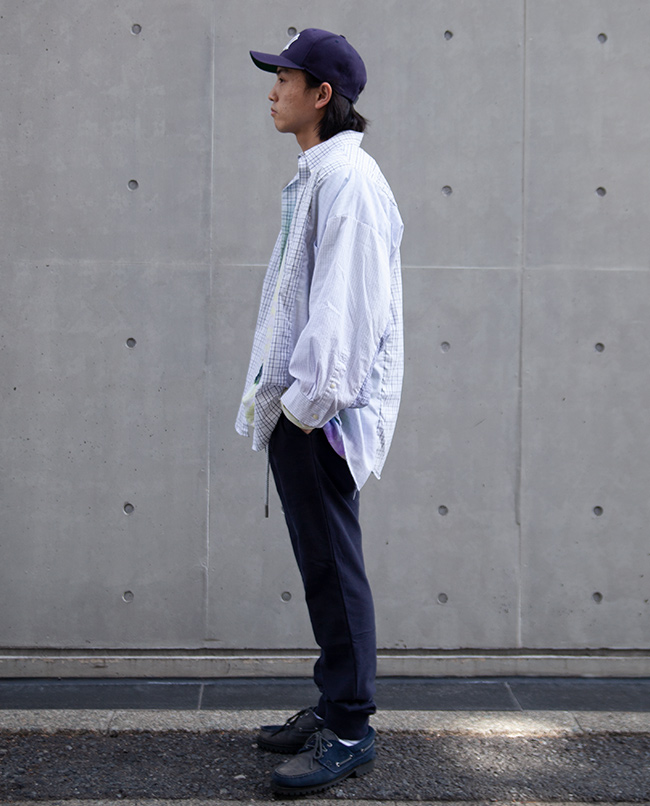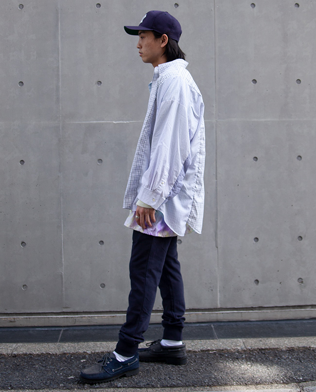 POINT / オーバーサイズです。 肩幅のあるがっちりした方でも肩を落として着ていただけるくらいのサイズ感です。 今回は長すぎる袖はロールアップ、裾はタックインすることでアクセントを加えました。 オーバーサイズならではの着こなしをお楽しみいただけます。