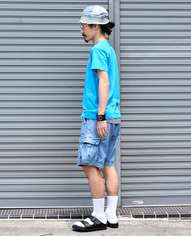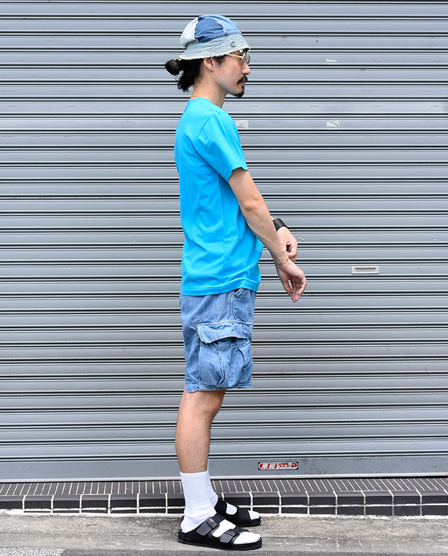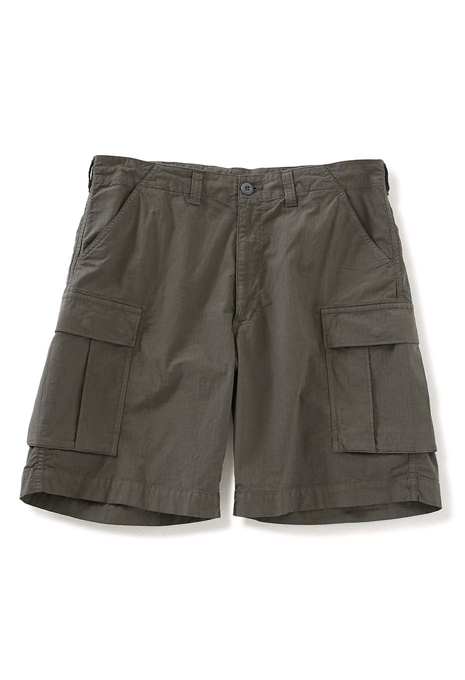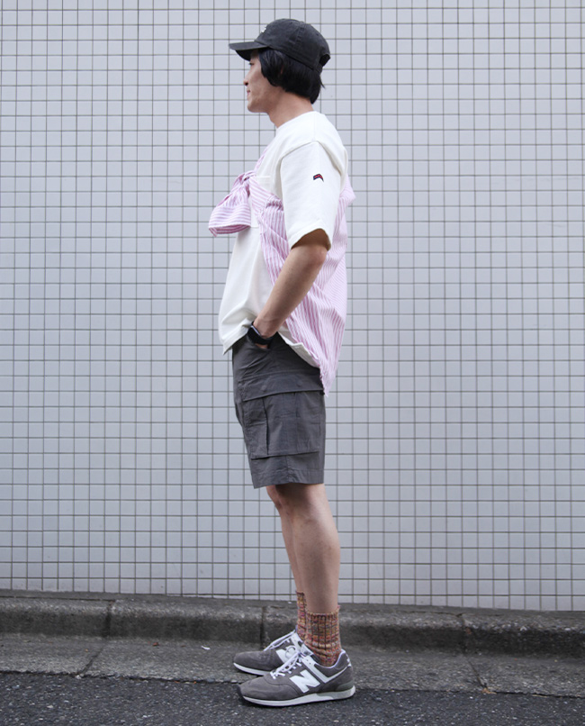 生地の裏面がパイル地になっており、吸湿性と通気性に優れたフィールソーグッド素材にリップストップが登場。とてもやわらかい肌ざわりで穿き心地が良く、ストレッチ性も持ち合わせており、デイリーユースに最適な素材です。 表面はリップストップ組織で耐久性があり、生地感もポイントです。ミリタリーモチーフのカーゴタイプのショーツに仕上げました。ワイドなシルエットで穿き心地も良く、見た目より軽いので真夏に手放せない一本です。