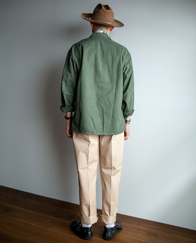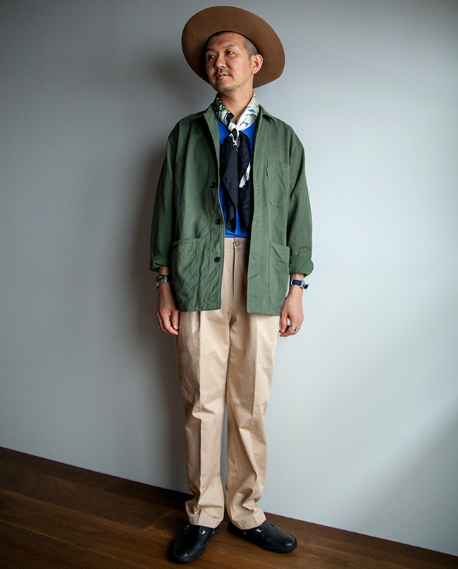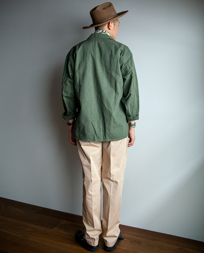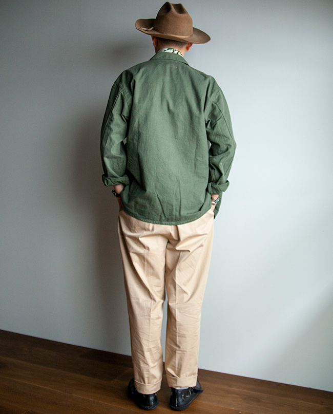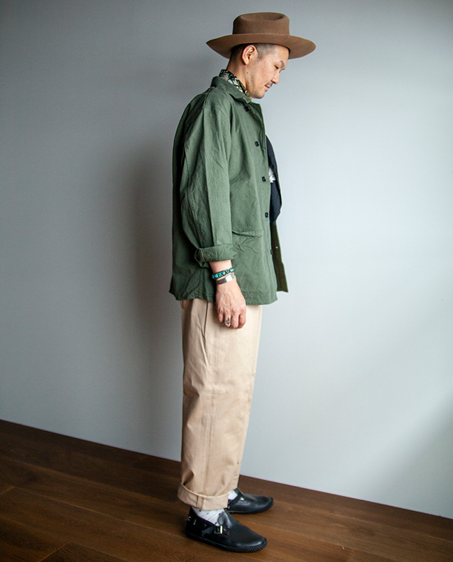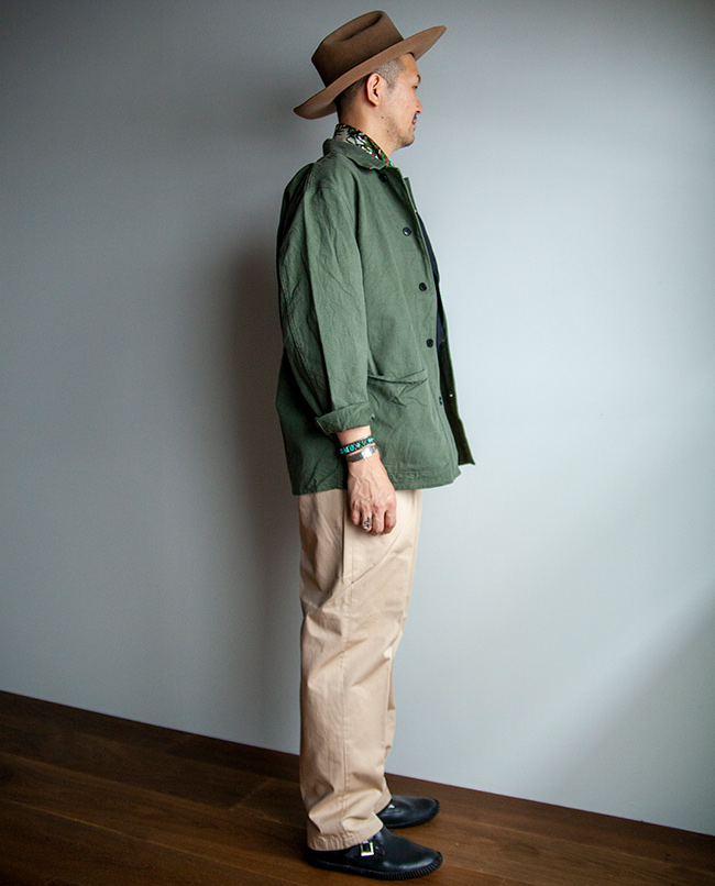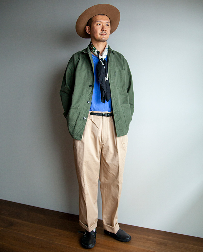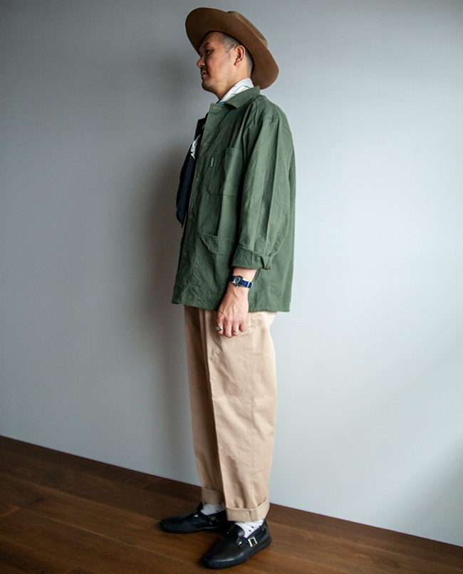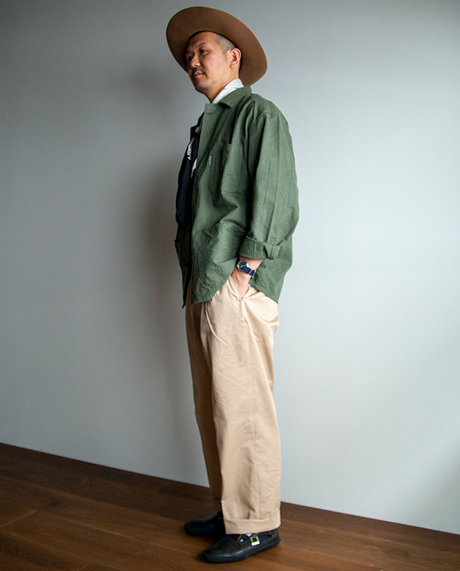 丹念に精紡された上質なコンパクトヤーンを贅沢に使用したチノ生地を使った2タックパンツ。高密度に織り上げることで、上品な表面感とハリとコシがあります。シルエットは程よい太さを保ちながらテーパードさせ、スニーカーや革靴、サンダルなどにも合わせやすいシルエットを意識しました。2本のインタックやサイド割の仕様など、きれい目のコーディネートにも使えるチノパンに仕上がっています。