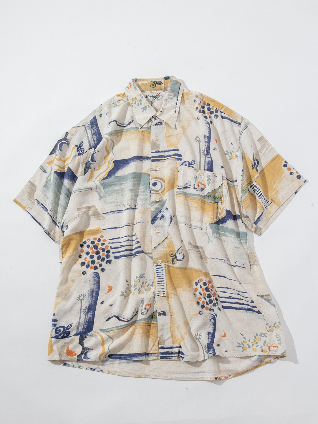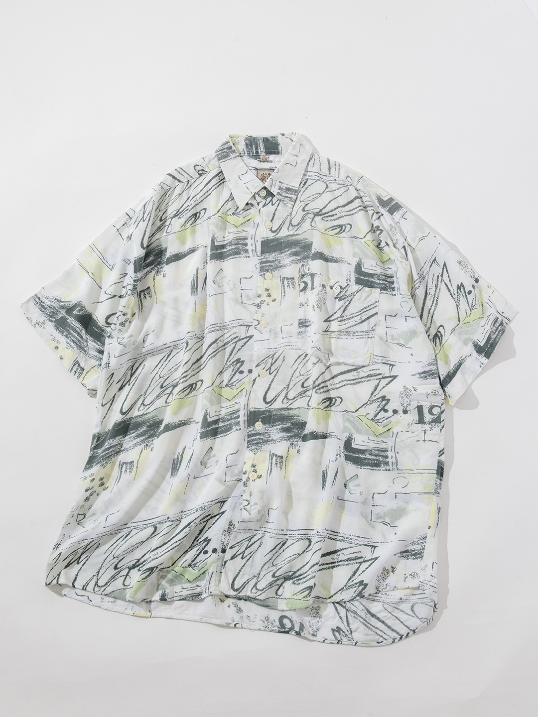 ヨーロッパ規格のプリントシャツです。かすれたようなプリント、筆記体のような線など抽象的な雰囲気の良いプリントとなっています。素材もとろみと軽さのあるヴィスコースレーヨン100%で柄も相まってアロハシャツ感覚で着用していただけます。