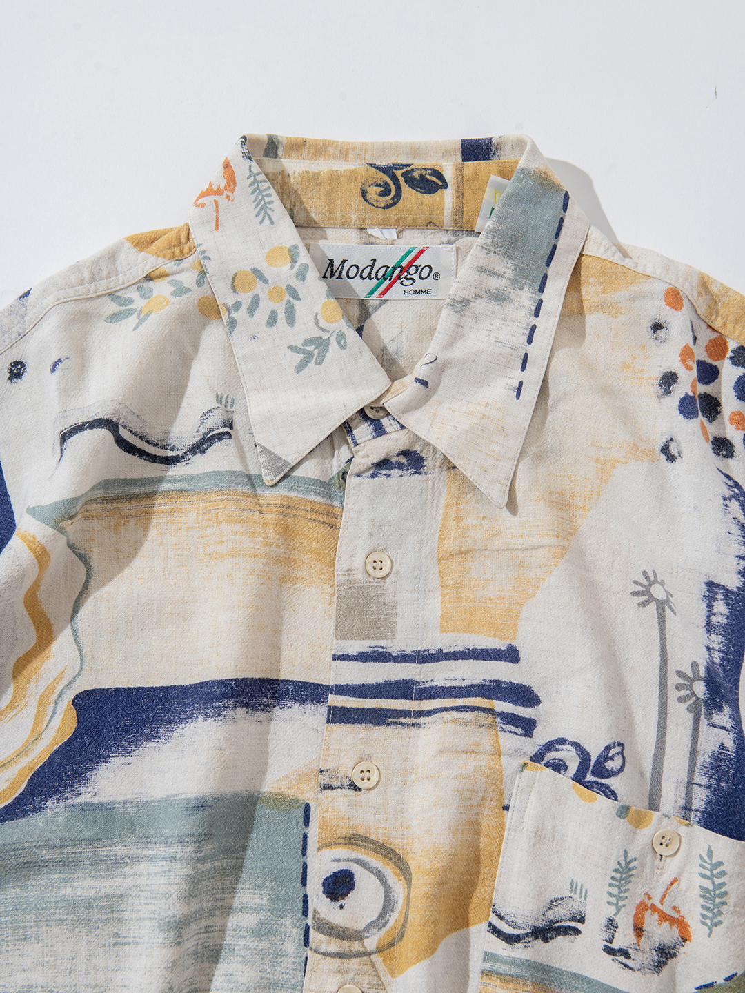 ヨーロッパ企画のプリントシャツです。花や景色と思われる柄がプリントされた抽象的なデザインとなっています。リネン、レーヨン混紡素材でとろみとシャリ感があり快適な素材感となっています。