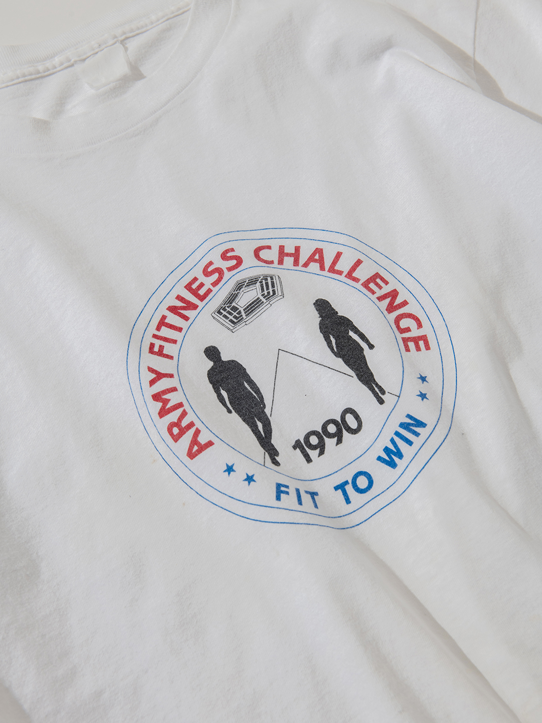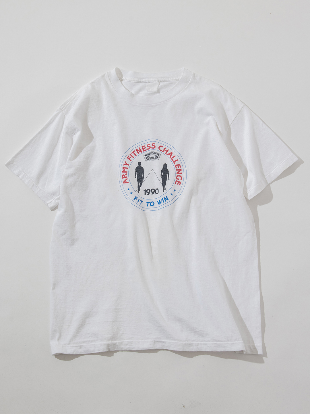 ARMY FITNESS CHALLENGEのプリントT-SHIRTです。学生と兵士の体力促進のためのプログラムことで、様々なフィットネスイベントやチャレンジが含まれており、チームワークとリーダーシップスキルを促進することを目的としたイベントのTシャツです。年代も1990年。フィットネスに興味がある方にぜひ着用していただきたい1枚です。