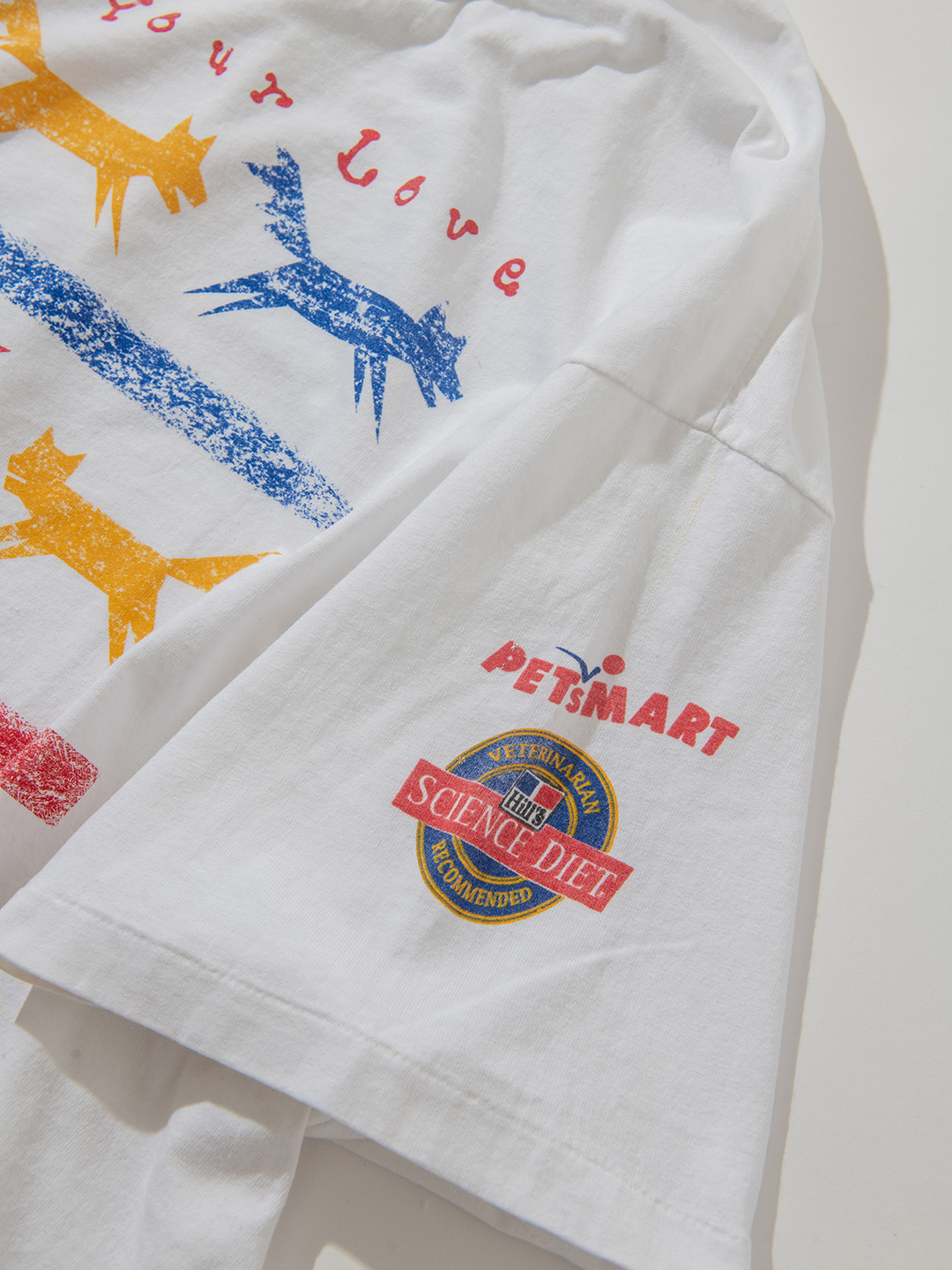 Pet SmartのプリントTシャツです。カナダのペット用品やサービスを提供しているチェーン展開のペットスーパーのものです。肩にはHill's SCIENCE DIETとというドッグフードのプリントもされており、イベントなどの際に協賛で作られたものかと思われます。