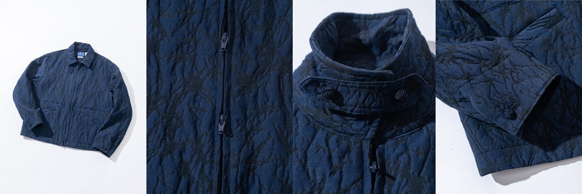 つかない、程よい分量感のボックスシルエットを採用。襟を立てた着こなしや、ダブルジップならではのスタイリングの変化も楽しめます。生地の適度なハリが立体感を生み、上品な光沢が洗練された印象を添えます。襟のタブや袖には、古くから縁起物として親しまれてきた「水引」を思わせるノットボタンをあしらいました。同素材のトラウザーズとのセットアップスタイルも可能です。