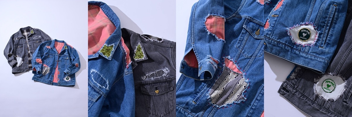 激しく使い込んだヴィンテージデニムを再構築したような、迫力のあるREMAKEトラッカージャケット。破れや擦れを別布で補強し、ハンドステッチで留めたラフなREPAIRが、リアルな経年変化を想起させます。破れた部分から覗くオンブレチェックのライニングも、このアイテムならではのポイント。