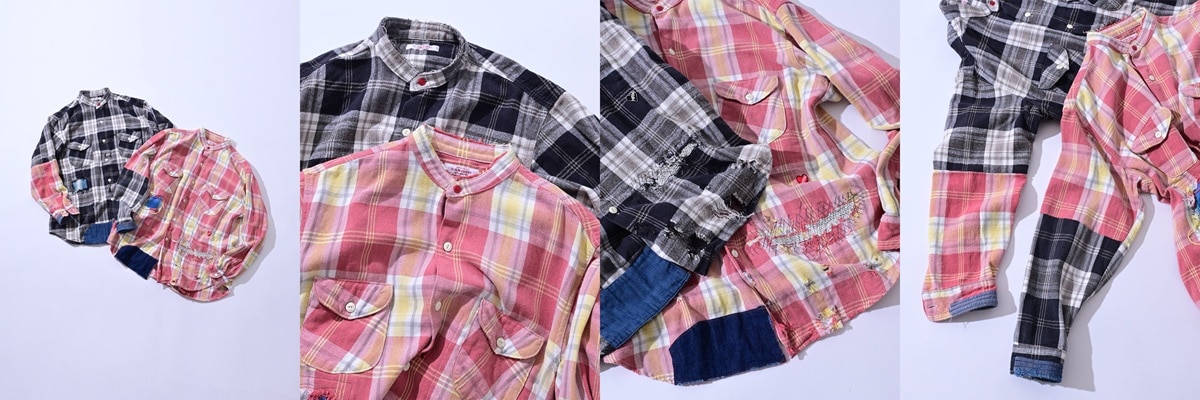 インド製のオリジナルネルチェック生地を使用。新品でありながら、長年着込んだような雰囲気を楽しめるREMAKEネルチェックシャツ。使い込まれた古着のシャツをイメージし、特に劣化が現れやすい裾まわりにREPAIRを集中。ボロボロになった袖を別のシャツの袖で移植したようなデザインも特徴です。