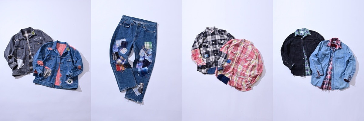 今回のシリーズでは、〈HOLLYWOOD RANCH MARKET〉および〈BLUE BLUE〉で使用してきた、聖林公司オリジナルの残反素材をリメイク用の 生地として採用。素材の背景を踏まえ、新たな形へと再構築しています。