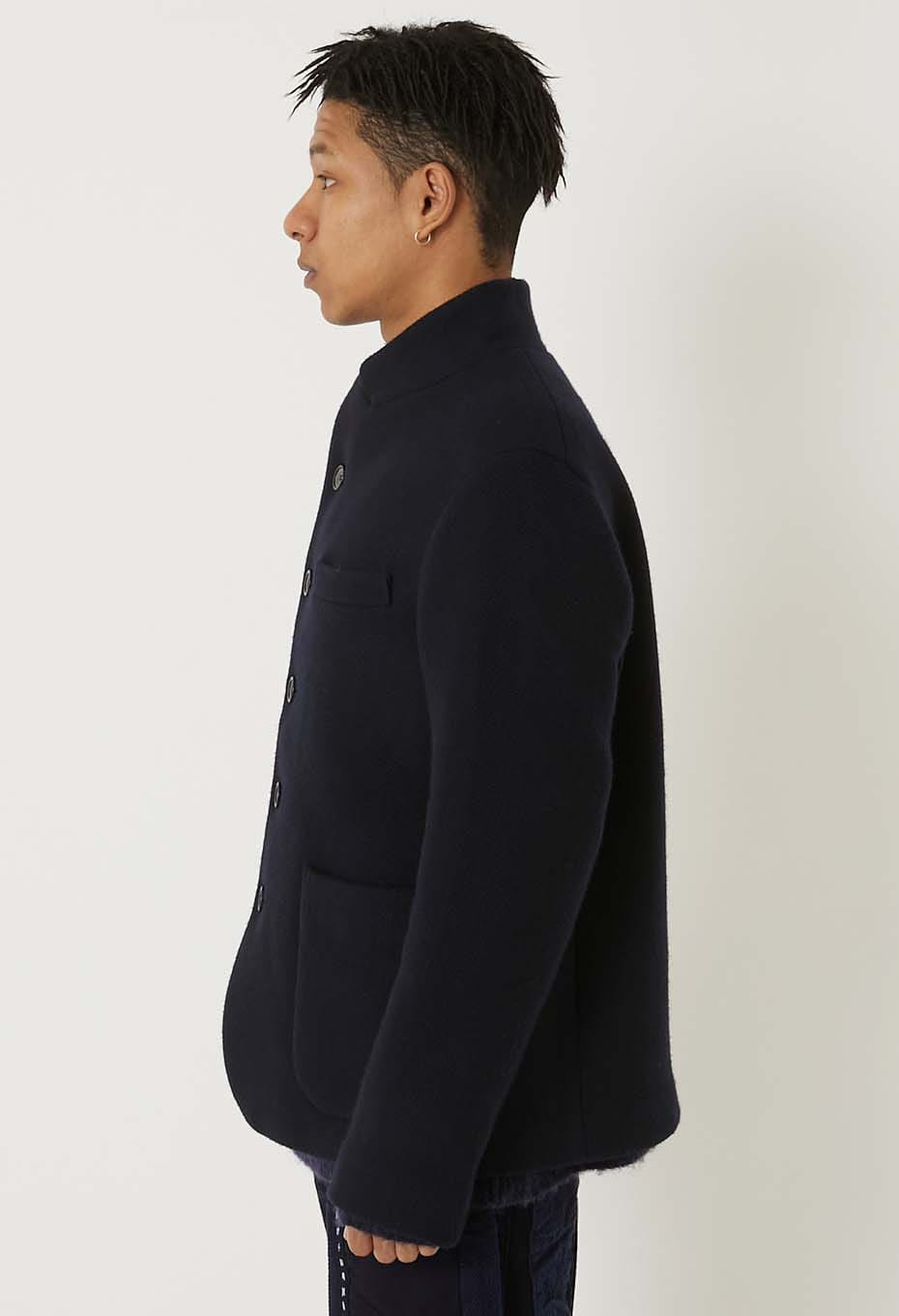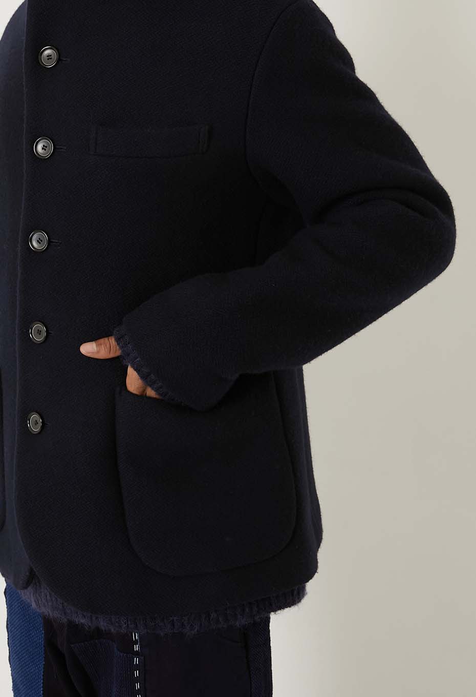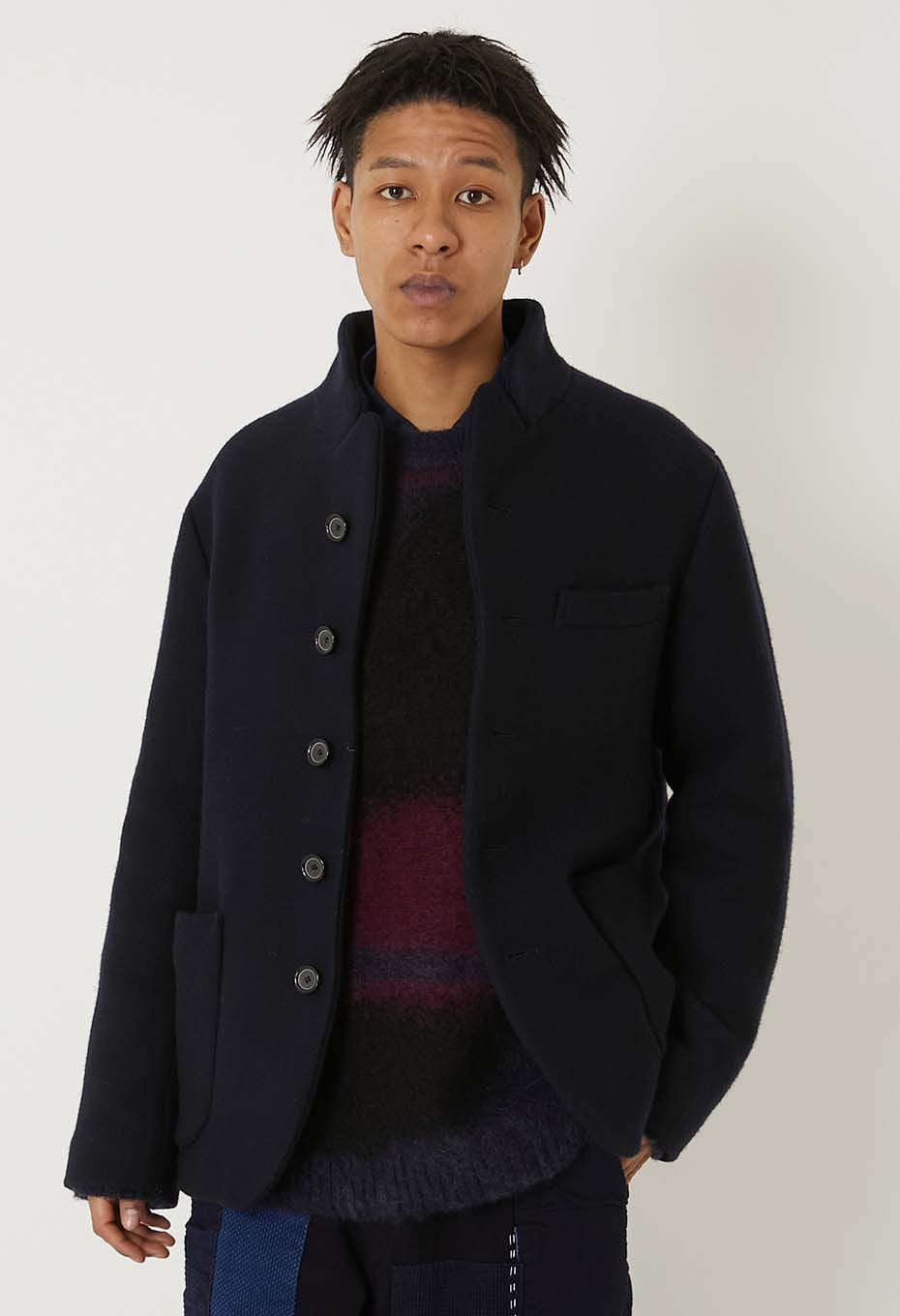ラペルの形をなだらかに修正し、よりベーシックな雰囲気に仕上げました。袖山がきれいに馴染むように改善。クラシックな雰囲気を持つスタンドラペルのジャケットをモダンなサイズ感に調整し、身頃や肩回りに適度なゆとりをもたせています。
