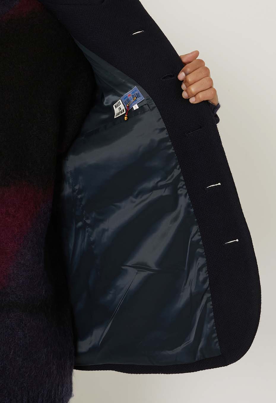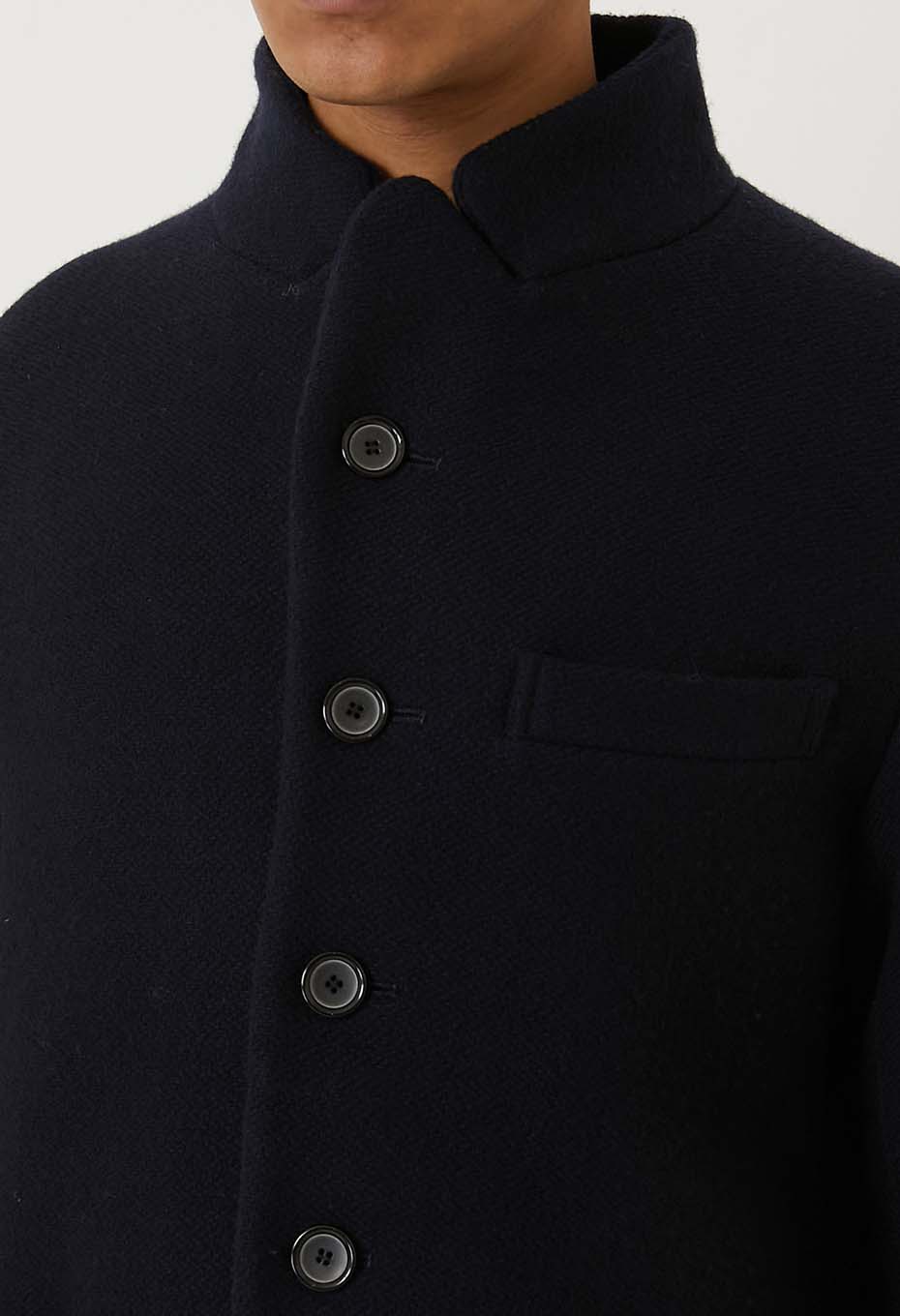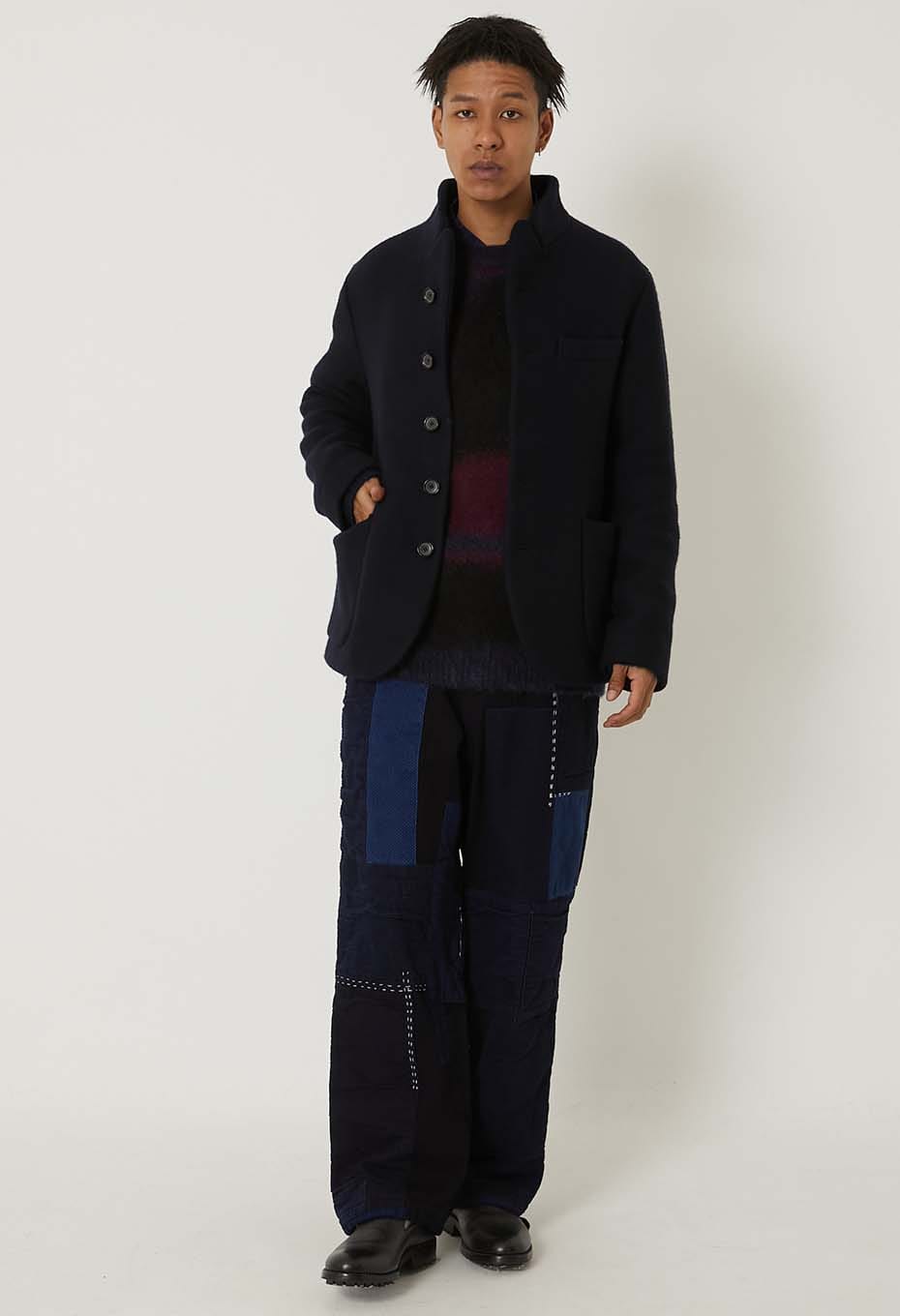 ラペルの形をなだらかに修正し、よりベーシックな雰囲気に仕上げました。袖山がきれいに馴染むように改善。クラシックな雰囲気を持つスタンドラペルのジャケットをモダンなサイズ感に調整し、身頃や肩回りに適度なゆとりをもたせています。
